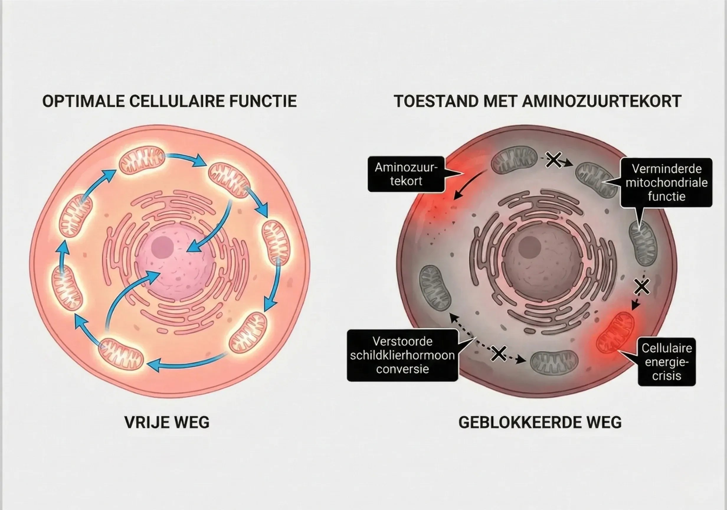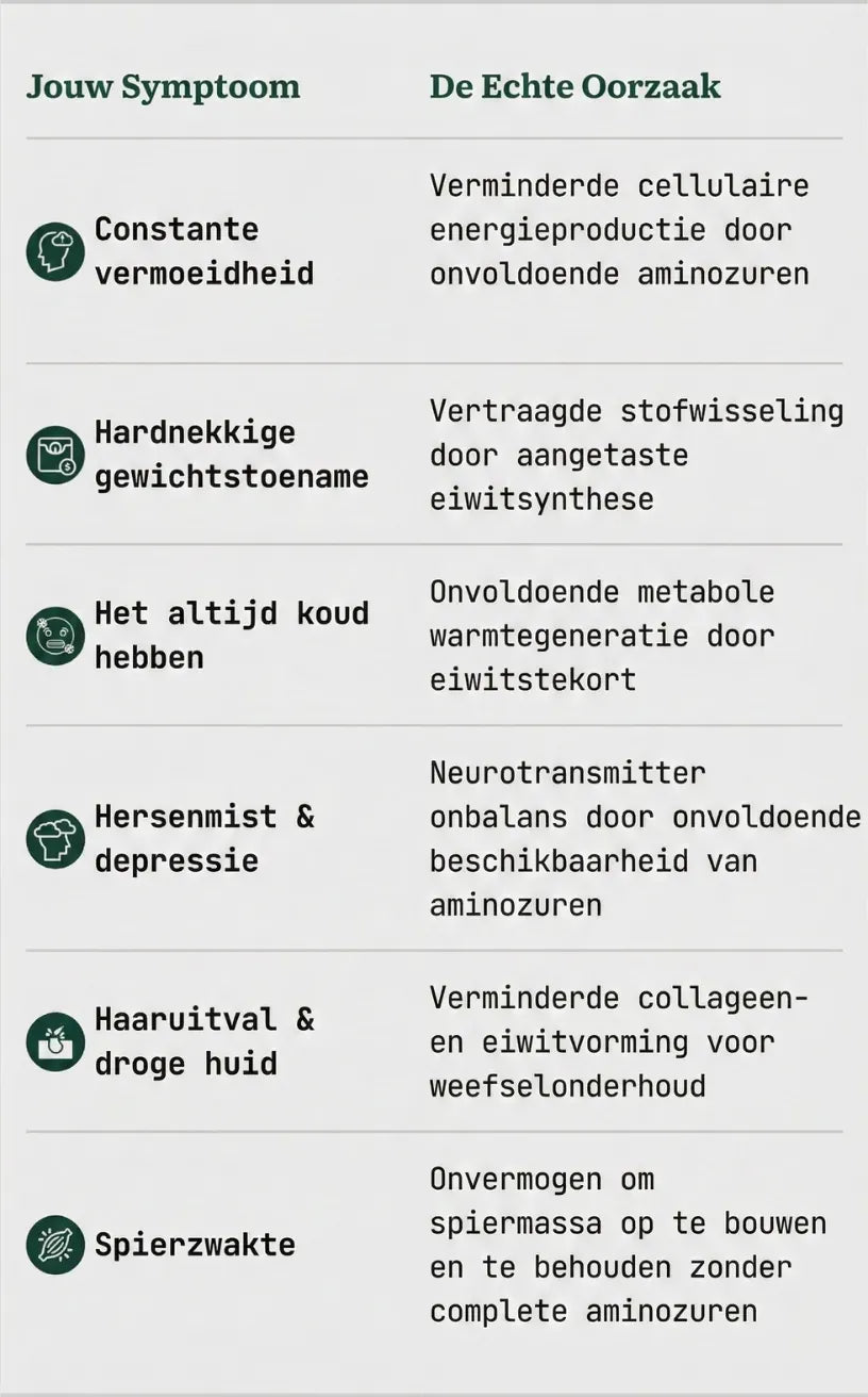 Je cellen hebben een tekort aan essentiële aminozuren, de bouwstenen van eiwitten die je lichaam niet zelf kan aanmaken en dus uit externe bronnen moet halen.