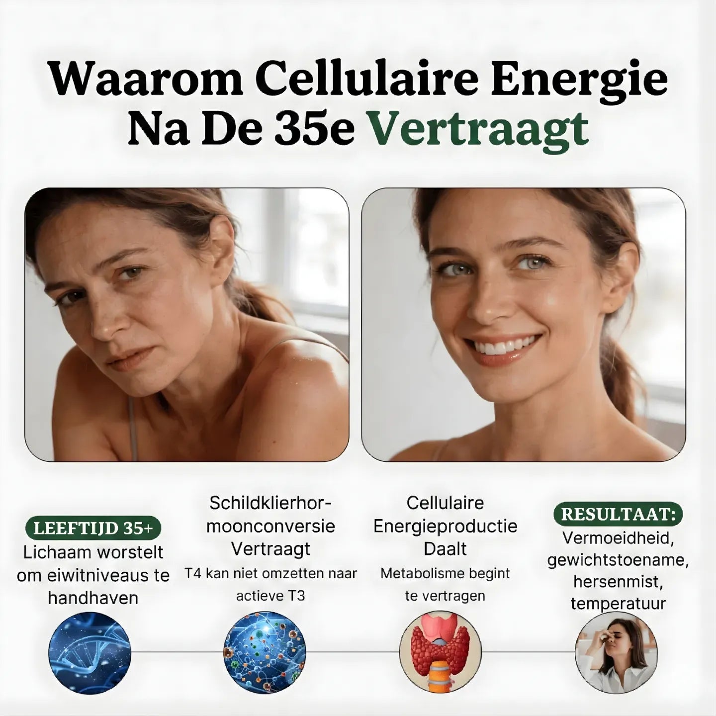 Door eiwittekort op cellulair niveau aan te pakken, ondersteunt het een optimale schildklierfunctie, herstelt het de natuurlijke energiestofwisseling en helpt het uw lichaam om temperatuur, gewicht, stemming en cognitieve functies op natuurlijke wijze te reguleren.