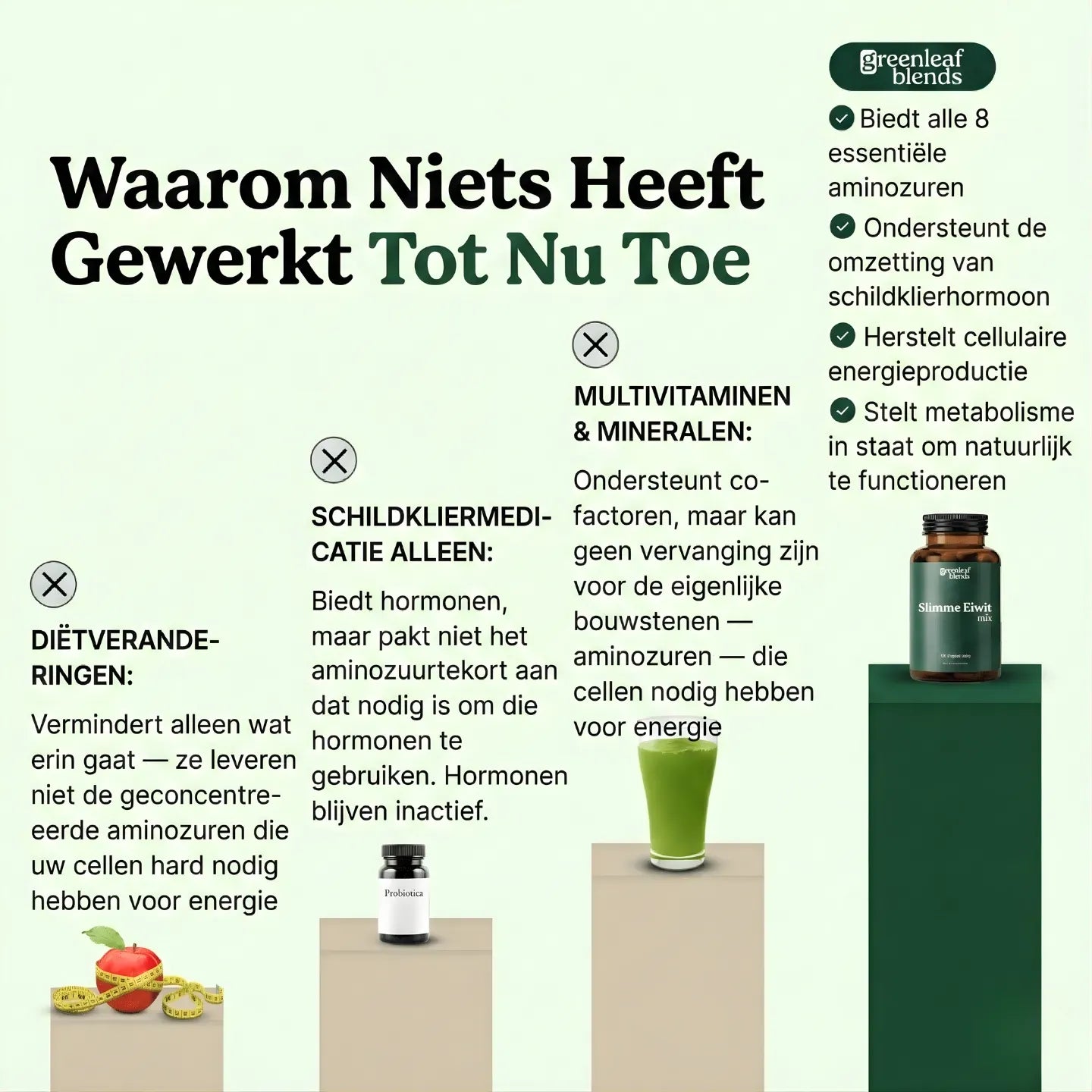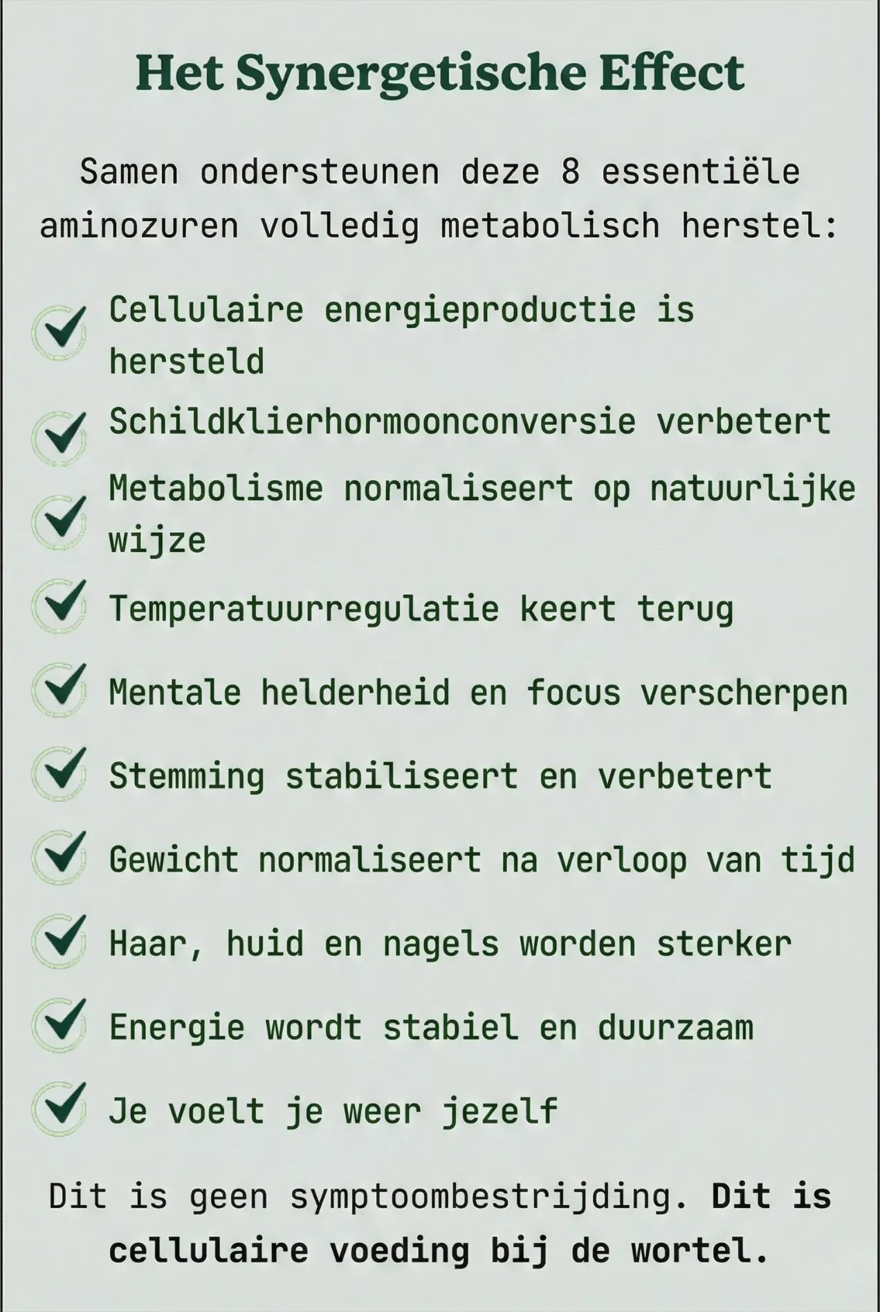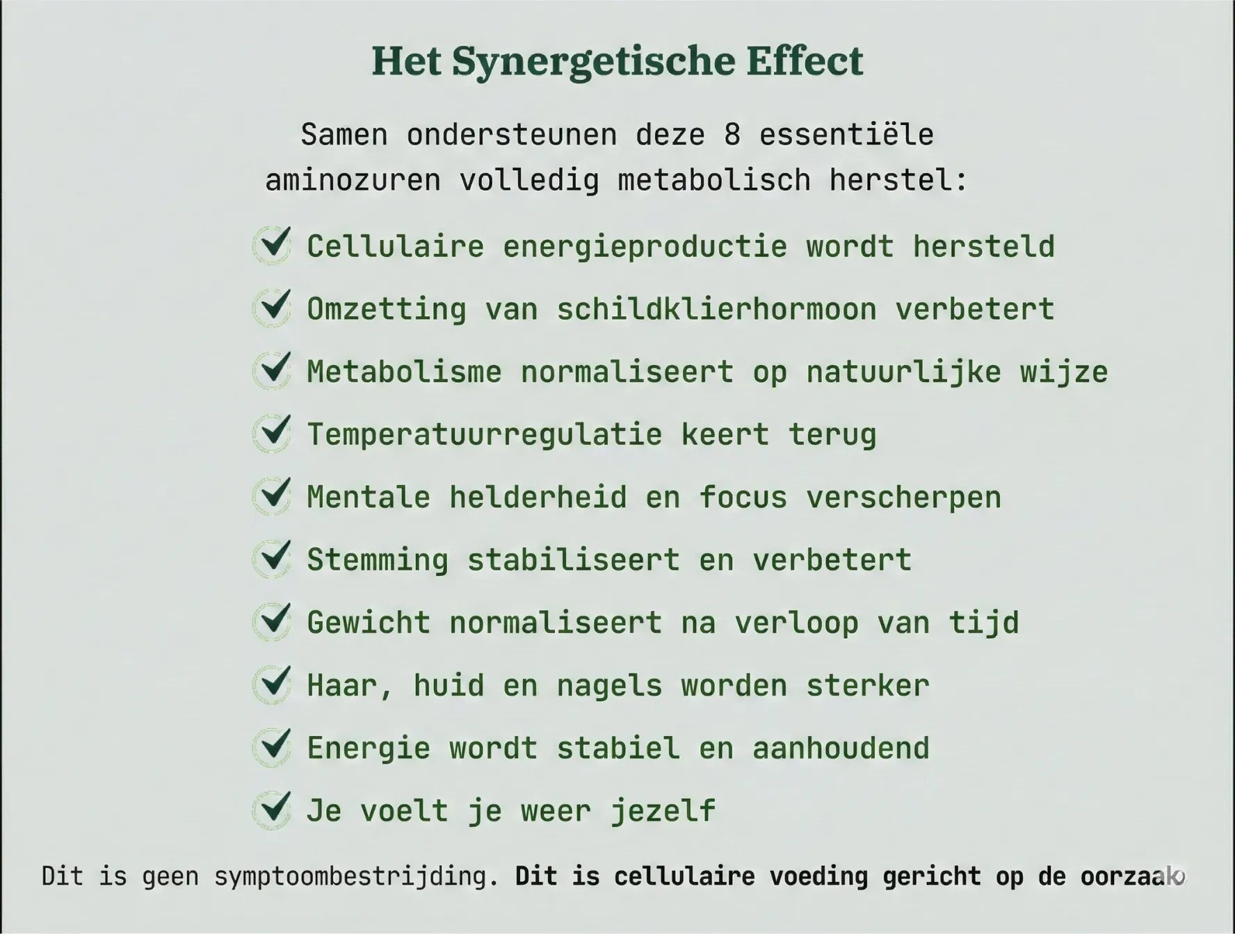 Wat deze formule uniek maakt, is de uitgebreide toevoer van essentiële aminozuren. De meeste supplementen zijn onvolledig of leveren onvoldoende hoeveelheden. Dit product levert alle 8 essentiële aminozuren in therapeutische hoeveelheden – precies wat nodig is voor de productie van cellulaire energie, de omzetting van schildklierhormonen, de synthese van neurotransmitters en het herstel van de stofwisseling. Wanneer cellen de bouwstenen hebben die ze nodig hebben, kan het lichaam schildklierhormonen effectief gebruiken."