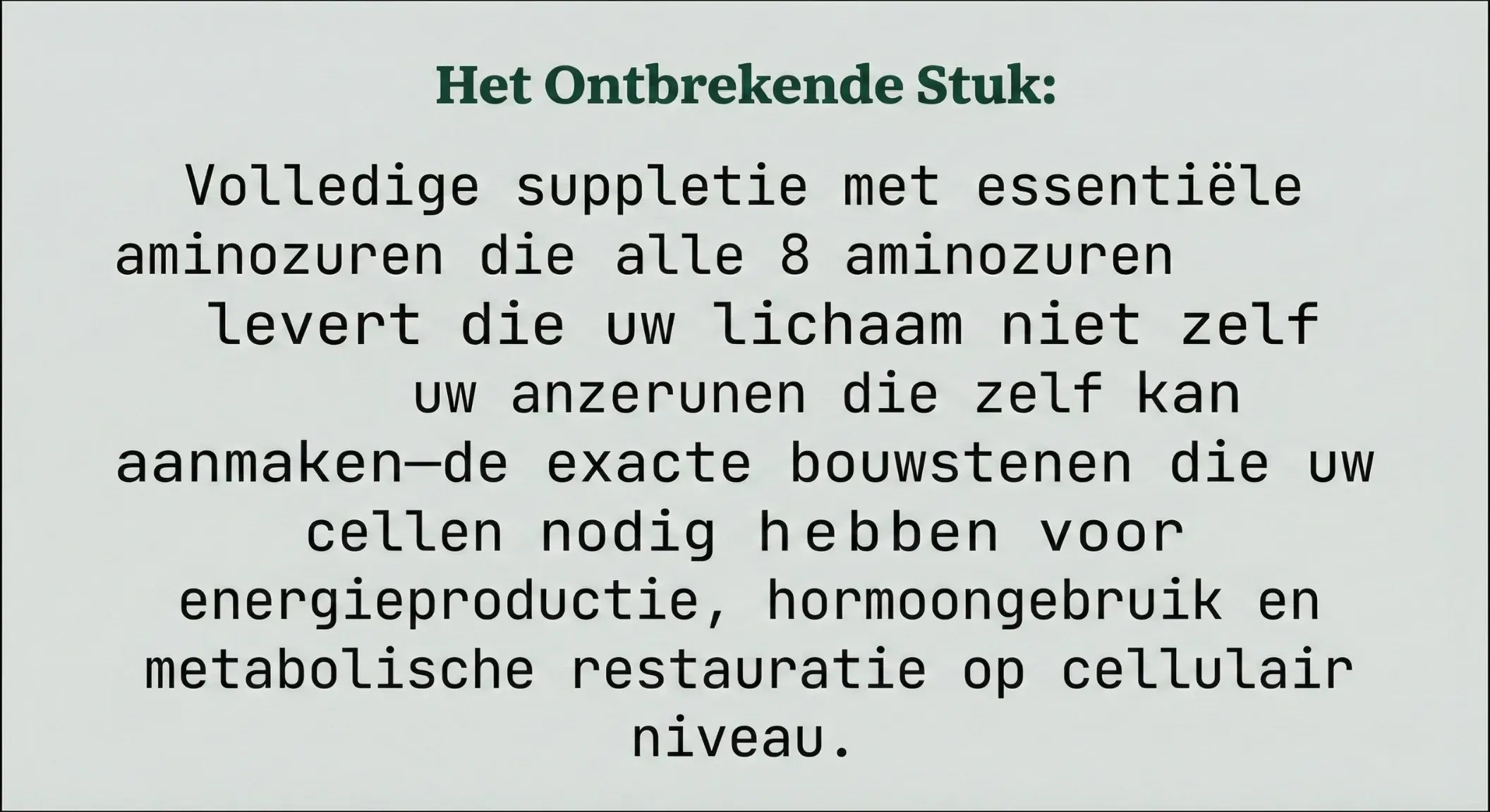 Vitaminen zijn cofactoren, maar ze kunnen niet in de plaats komen van de eigenlijke bouwstenen – aminozuren – die je cellen nodig hebben om energie te produceren, eiwitten te synthetiseren en de stofwisseling te ondersteunen.